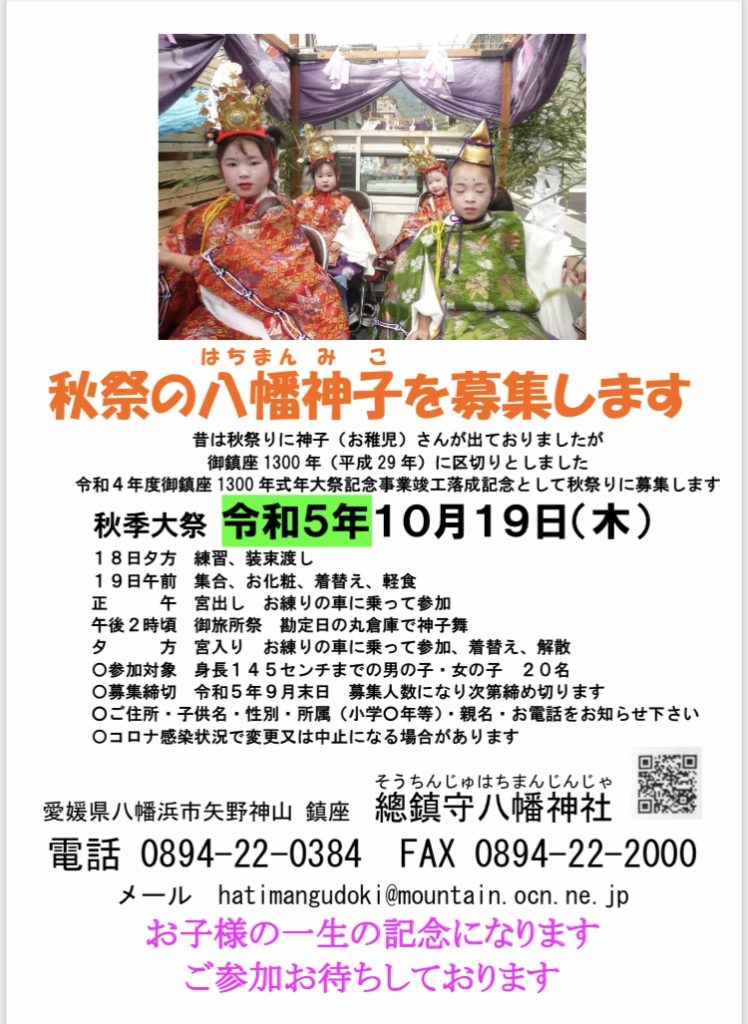 八幡神社は、地名「八幡浜」の由来と伝えられ、養老元年(717年)に創建されました。全国の八幡神社の中でも四番目に古いとされ、ご鎮座より1300年あまり、地域と共に歩んでまいりました。これからも「八幡浜」の地を見守り続ける当社へ、ぜひお参りください。