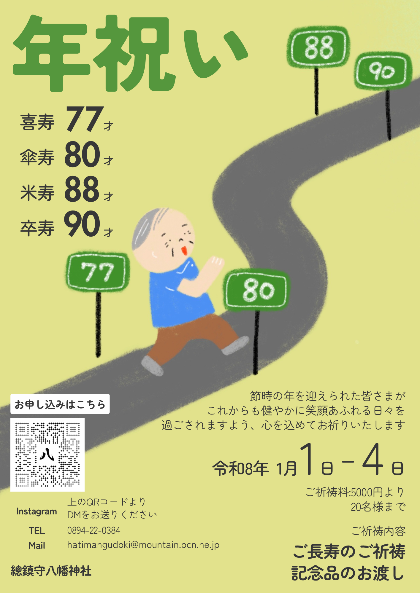 總鎮守八幡神社では、喜寿・傘寿・米寿などの歳祝いの御祈祷を執り行っております。